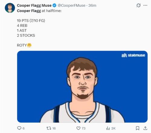 次节弗拉格更为爆炸,单节5中5+罚球2中2,各种高难度的后仰跳投命中,单节12分4篮板1助攻1盖帽,半场弗拉格17分钟,10中7+三分1中1,拿到19分4篮板1助攻1抢断1盖帽,独行侠媒体盛赞最佳新秀。
