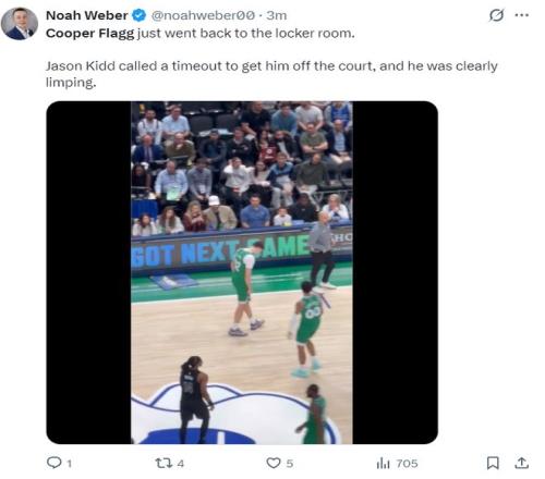 第三节弗拉格打了7分钟,弗拉格在一次追防过程中左脚意外扭伤,随后弗拉格一瘸一拐的走回了更衣室。独行侠记者表示:基德主动叫暂停换下弗拉格,弗拉格的确是一瘸一拐的。