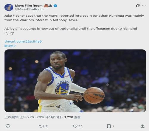 北京时间1月13日,据NBA名记Jake Fischer报道,独行侠跟库明加的传闻,主要是源于勇士对安东尼-戴维斯感兴趣。但是,由于浓眉左手韧带损伤无确切的回归时间,外界普遍认为在今年休赛期之前,浓眉不会进入交易讨论的范围。