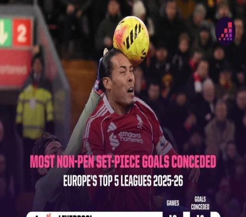 数据网站OPTA统计,在2025-26赛季欧洲五大联赛中,利物浦、伯恩茅斯与诺丁汉森林三支球队并列成为非点球定位球失球最多的球队,均为18场比赛失球12个。根据OPTA的统计,在2025-26赛