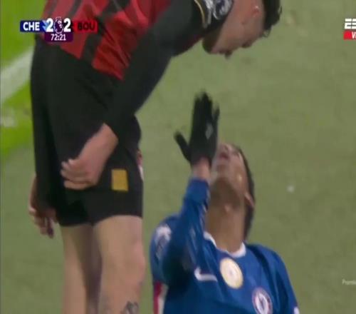 在切尔西对阵伯恩茅斯的比赛中,球队新星埃斯特旺表现十分活跃。而比赛中出现了一幕出人意料的画面:在被对手阿莱士-希门尼斯撞倒后,他竟向对方送出飞吻,还当面大笑。