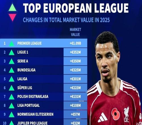 德国转会市场统计了2025年欧洲联赛身价涨跌榜,其中英超上涨10.9亿欧居首,法甲第二。