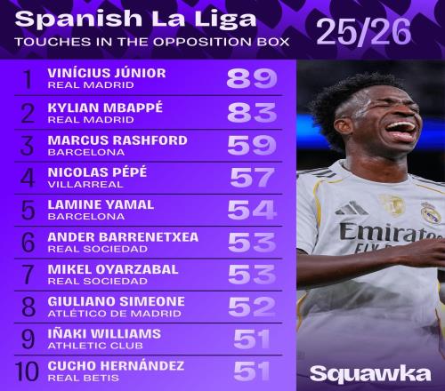 北京时间10月29日,知名数据平台Squawka列出了本赛季西甲联赛迄今为止,在对方禁区内触球次数最多的10位球员,皇马球星维尼修斯89次领跑榜单,姆巴佩83次位列第二。1、维尼修斯(皇家