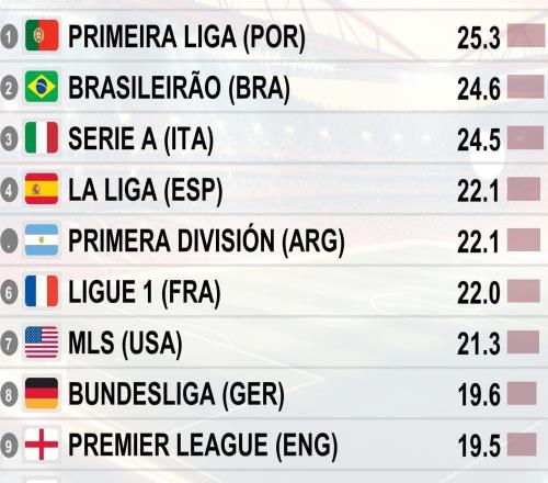 当地时间10月13日,瑞士足球天文台统计了各国联赛每90分钟的犯规情况,其中葡超以25.3次犯规位居榜首,巴甲以24.6次位列第二,意甲以24.5次位列第三。各联赛每90分钟犯规次数榜1、